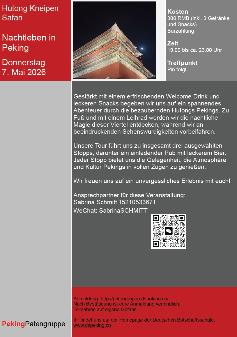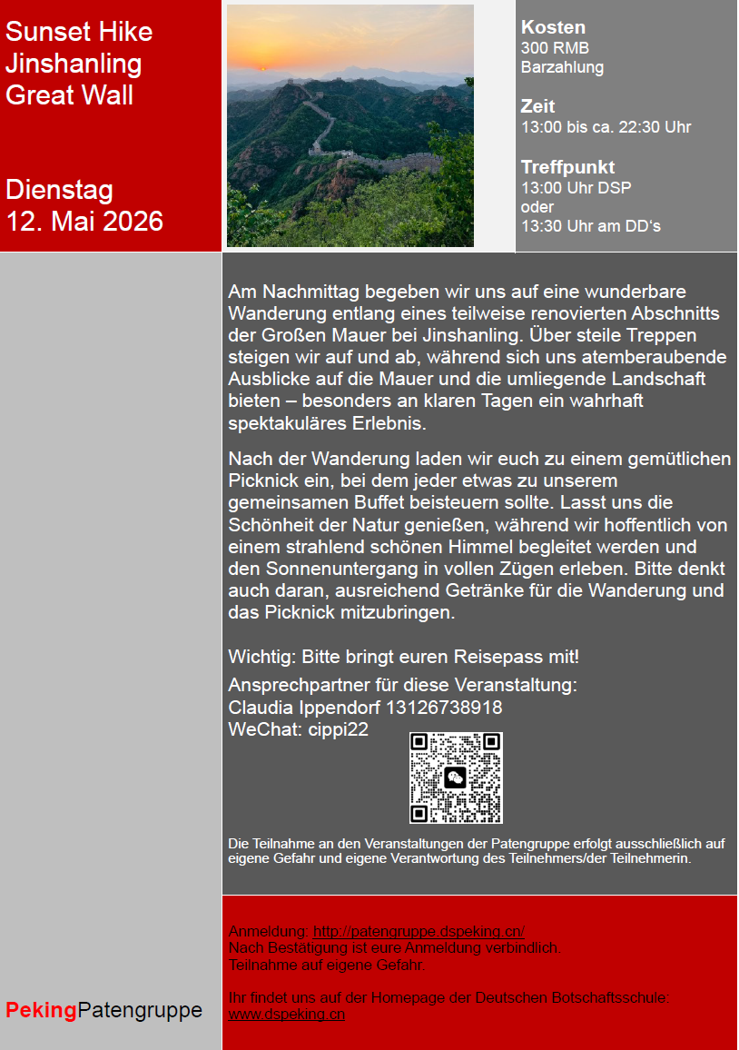 Alle Veranstaltungstermine findet ihr unter "Veranstaltungen der Patengruppe" und auf der Homepage der Deutschen Botschaftsschule Peking. Dort erhaltet ihr auch weitere Informationen und viele nützliche Tipps rund um das Leben in Peking.